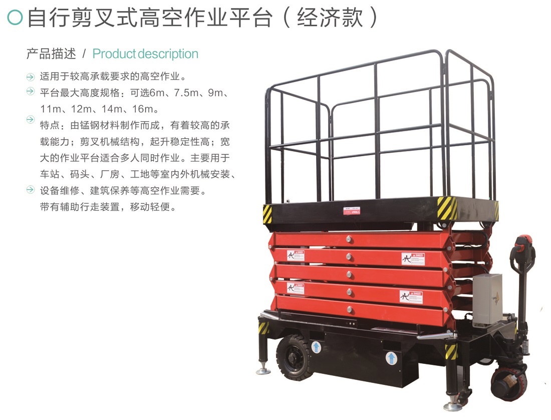 特點:由錳鋼材料制作而成,有著較高的承載能力;剪叉機械結構,起升穩定性高;寬大的作業平臺適合多人同時作業。主要用于車站、碼頭、廠房、工地等室內外機械安裝、設備維修、建筑保養等高空作業需要。帶有輔助行走裝置,移動輕便。