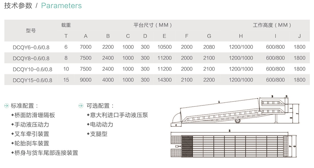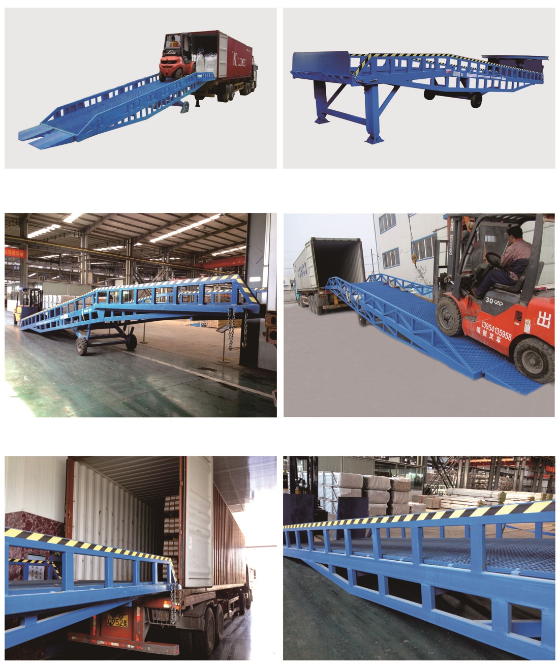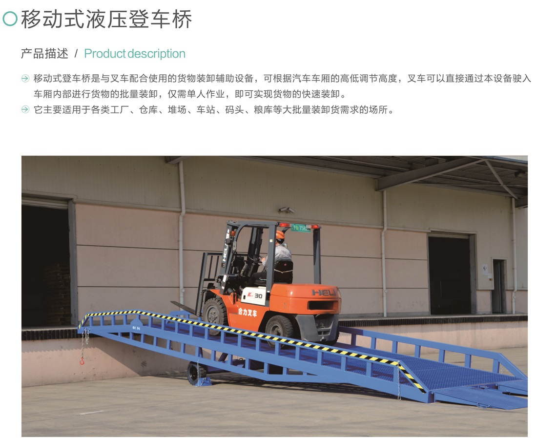 移動式登車橋是與叉車配合使用的貨物裝卸輔助設備,可根據汽車車廂的高低調節高度,叉車可以直接通過本設備駛入車廂內部進行貨物的批量裝卸,僅需單人作業,即可實現貨物的快速裝卸。